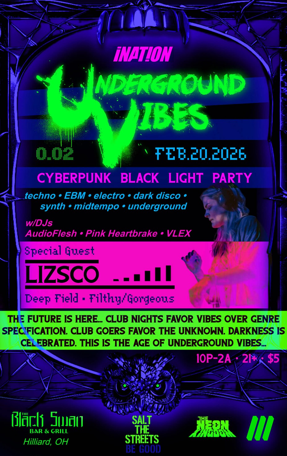 Join us for our 2nd edition of Underground Vibes; a monthly Cyberpunk Black Light Party, where darkness is explored and embraced through pulsating EBM basslines; techno grooves; decadent dark disco; synthwave soundscapes and brooding midtempo akin to a John Wick club scene. Dress for an interactive UV dance experience or come as you are. All that we ask, is that you bring the darker version of yourselves...